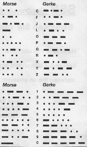 Das ursprüngliche, von Morse verwandte System hatte teilweise unterschiedlich lange Zeichen, und einige Zeichen setzten sich aus anderen Grundzeichen zusammen. Dies gab Anlass zu Fehlern und war daher nur schwer zu erlernen. Rund die Hälfte von Morses ursprünglichen Zeichen sind erhalten geblieben. Grundlage des Systems nach Gerke sind ein kurzes Zeichen und dreimal so lange „Langzeichen". Jedes Zeichen ist danach ein Unikat. Die Zeichen und Wortabstände wurden auch festgelegt, die Ziffern folgen einem systematischen Aufbau.