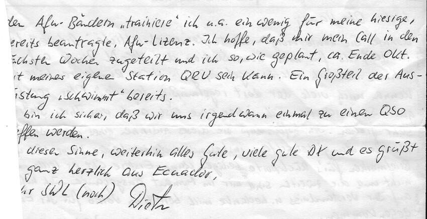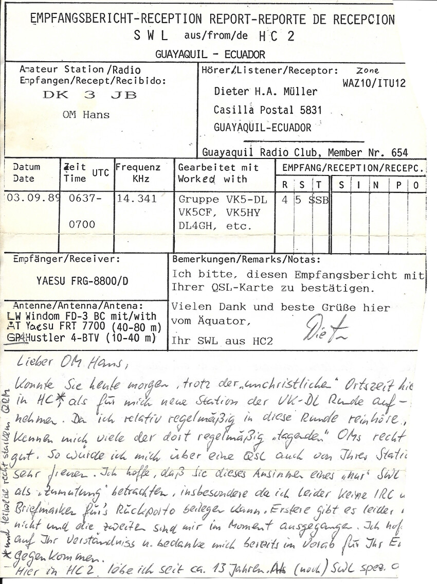 Am 3. September 1989 nahm ich daran teil - und wurde von einem SWL (also Kurzwellen-Hörer) aus Ecuador in Südameriaka gehört. Er sandte mir den untenstehenden Empfangsbericht (leider wurde der rechte bzw. linke Rand des Schreibens durch unachtsames Auftrennen des Briefumschlages beschnitten). Gegenwärtig - in 2022 - liegt dieser Zeitpunkt 33 Jahre zurück!