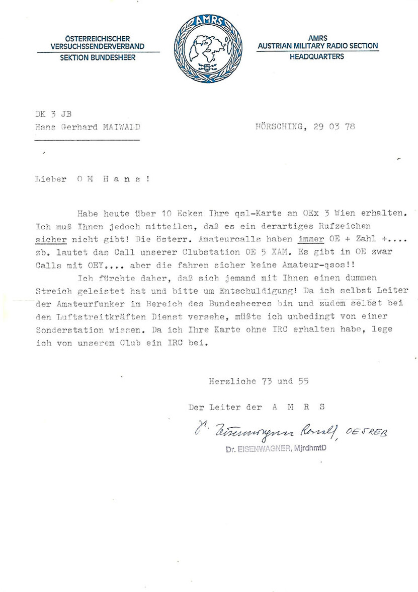(AUSTRIAN MILITARY RADIO SECTION) Dr. Eisenwagner, MjrdhmtD (Rufzeichen OE5REB):