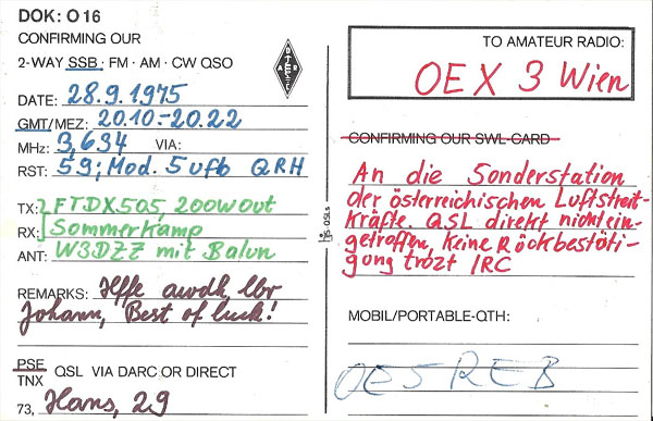 Am 28. September 1975 hatte ich auf dem 80 Meter Band eine Funkverbindung mit einer (angeblichen) Sonderstation der Österreichischen Luftstreitkräfte, die das Call „OEX 3 Wien" führte. Da es durchaus solche Sonderrufzeichen geben kann, erschien mir dieser Funkkontakt durchaus realistisch und plausibel. Trotz des sehr guten Signales fiel allerdings auf, dass die verwendete Frequenz auf 3,634 MHz unstabil war und „wanderte" - was für eine solche Station eigentlich seltsam war. An was ich mich noch erinnern kann, war, dass der (Schwarz)-Funker nach Nennung meiner Stationsdaten erzählte, „man sei eine Schuhnummer größer bestückt".