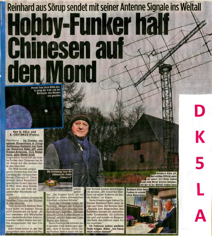 Was Funkamateure mit ihrem enormen Fachwissen leisten können, demonstrierte kürzlich der 69-jährige Reinhard Kühn (DK5 LA) aus Sörup in Schleswig Holstein. Mit seiner horizontal und vertikal schwenkbarer Richtfunkantenne, bestehend aus mehreren, gestockten Kreuz-Yagis, sendete er Funksignale chinesischen Satelitten, welche die Sonde der Chinesen auf der Rückseite des Mondes steuern und auch Fotoauf-nahmen machen.